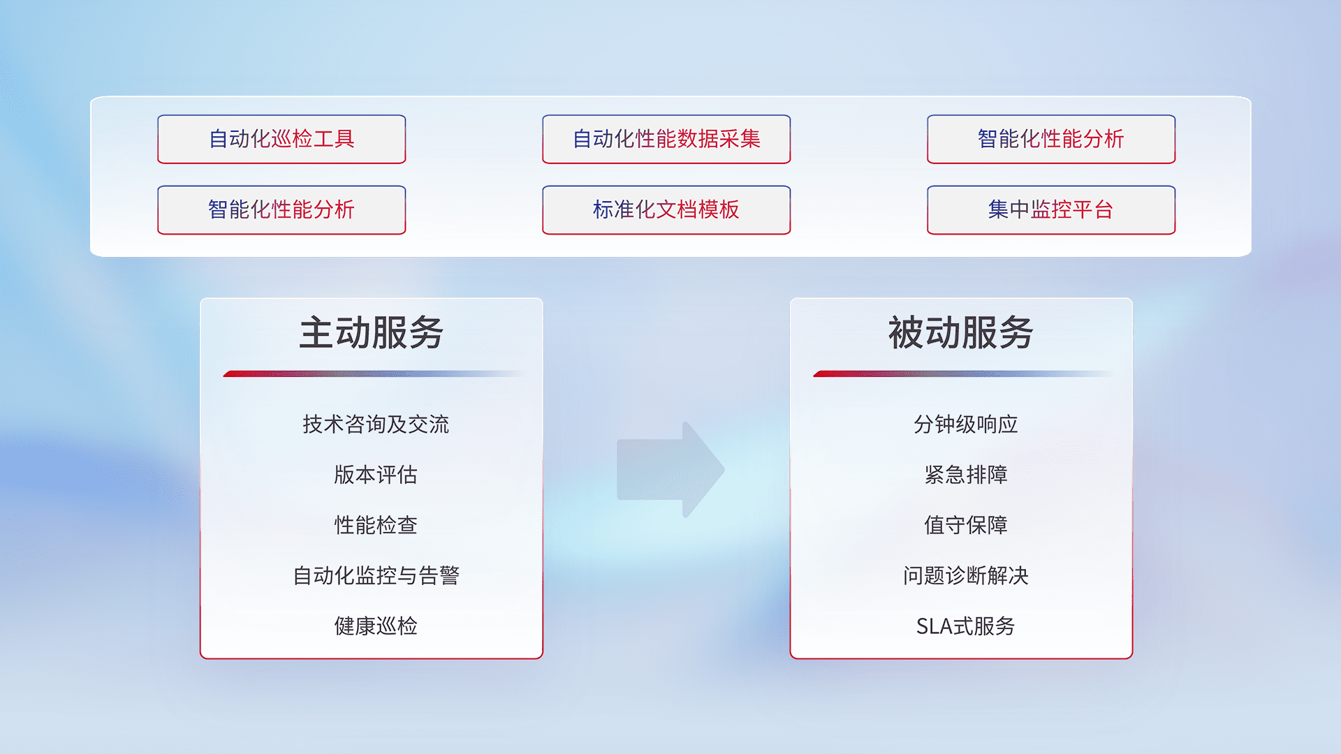 智能化工具和标准化文档,,,保障服务质量,,,提供主动服务(包含技术咨询、、、、版本评估、、、性能检查、、、、自动化监控与告警、、健康巡检)和被动服务包含(分钟级响应、、、紧急排障、、、、值守保障、、、问题诊断解决、、SLA服务)。。。
